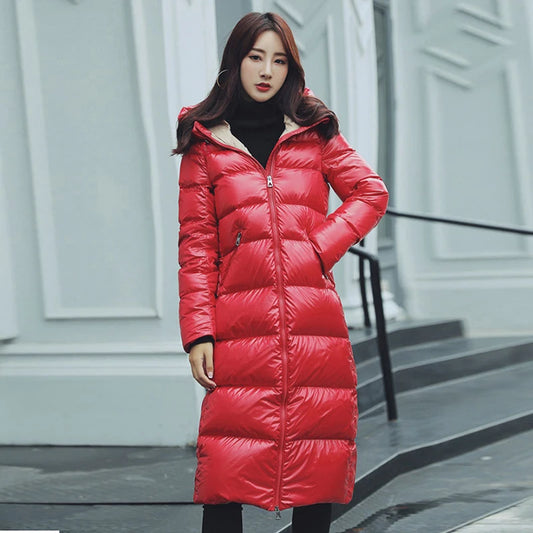 90% Thicken White Duck down Jackets Shiny Side Hooded Women Warm down Coats Long Slim plus Size Female down Outwear HK627